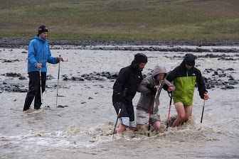 Echter, wat je niet afmaakt, maakt je sterker. Dus hup, de volgende dag weer in de benen. En omdat mijn schoenen toch door en door nat waren, vond ik het niet meer nodig om tijdens het doorwaden van een gletjer-rivier mijn sandalen aan te trekken. Ik liep de rest van de dagen wel op neopreen sokken en mijn wandelschoenen. Weken na de tocht kwam de huid eindelijk los: de blaren zaten bijna een halve centimeter diep. Maar pijn had ik niet